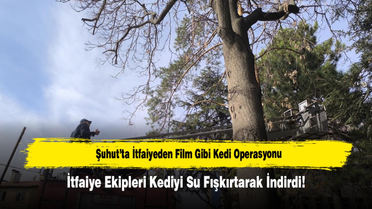 İlçede yaşayan vatandaşlar, birkaç gündür ağaçtan inmeyen kedinin sesini duyunca durumu Şuhut Belediyesi İtfaiye Amirliği ekiplerine bildirdi. Olay yerine gelen ekipler, çam ağacının dallarının sık ve dar olması nedeniyle merdivenli araçla müdahalenin güç olacağını fark etti. Bunun üzerine ekipler, su fışkırtma yöntemiyle kediyi bulunduğu daldan güvenli şekilde aşağı indirmeyi başardı.