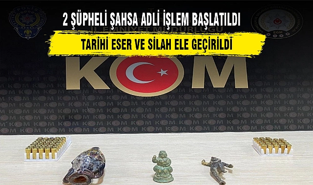 Bunun üzerine harekete geçen KOM ekipleri, T.Ç. (53) ve E.B.B. (32)’nin iş yeri ve ikametgahlarında arama yaptı. Yapılan aramada, tarihi eser olduğu değerlendirilen 2 heykel, 1 gözyaşı şişesi, 2 ruhsatsız tabanca, 1 pompalı tüfek, 66 tabanca fişeği ve 1 şarjör ele geçirilerek muhafaza altına alındı.