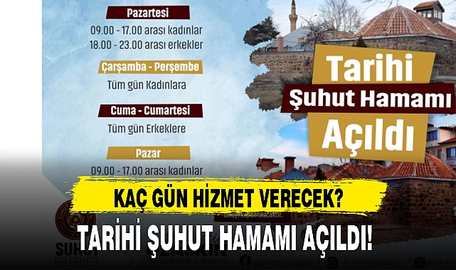 Şuhut Belediyesi tarafından yapılan açıklamada Tarihi Şuhut Hamamı’nın kullanıma açıldığı ve haftanın 6 günü hizmet vereceği duyuruldu.