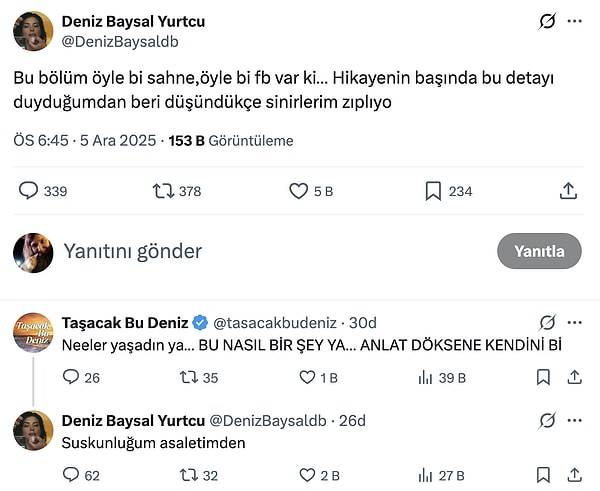 Deniz Baysal, yeni bölüm yayınlanmasına dakikalar kala X hesabından yaptığı paylaşımla izleyiciyi alarma geçirdi. Oyuncu, 9. bölümde yer alan bir detayın yeni bölümde önemli bir flashback ile yeniden gündeme geleceğini duyurdu. Baysal paylaşımında şu ifadeleri kullandı: “Bu bölüm öyle bir sahne, öyle bir flashback var ki… Hikayenin başında bu detayı duyduğumdan beri düşündükçe sinirlerim zıplıyor.” Bu açıklama dizinin takipçilerini hem heyecanlandırdı hem de ne olacağına dair tahmin yarışına soktu.
