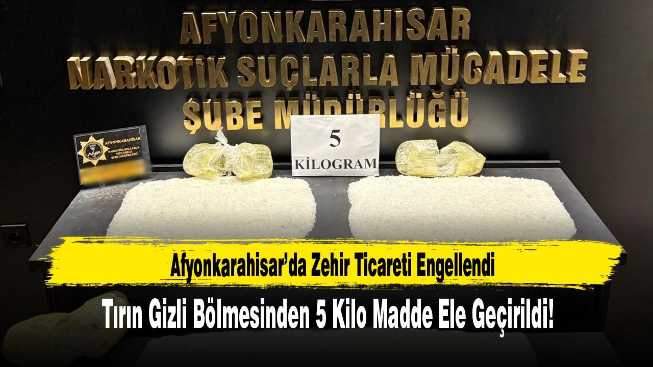 Afyonkarahisar İl Emniyet Müdürlüğü Narkotik Suçlarla Mücadele ekipleri, uygulama noktasında durdurulan bir tırda 5 kilogram uyuşturucu madde ele geçirdi. Olayla ilgili gözaltına alınan şüpheli M.S., çıkarıldığı mahkemece tutuklanarak cezaevine gönderildi.