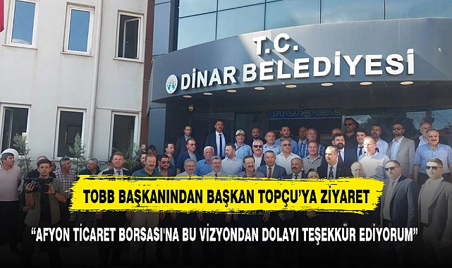 Afyonkarahisar'ın Dinar ilçesinde TOBB Başkanı Rifat Hisarcıklıoğlu'nun katılımıyla gerçekleşen Lisanslı Depoculuk Tesisinin açılış törenin ardından ilçede bir dizi ziyaret gerçekleştiren TOBB Başkanı Rifat Hisarcıklıoğlu, Milletvekili İbrahim Yurdunuseven ve heyet ile birlikte Dinar Belediye Başkanı Veysel Topçu'yu ziyaret etti. Ziyarette Başkan Topçu’ya hayırlı olsun dileklerini ileten Hisarcıklıoğlu: ““TMO ve TOBB ortak çalışmalar gerçekleştirdik. Ticaret borsalarımız hayvancılık ve tarımda büyüme sağladı. Afyon Ticaret Borsası'na bu vizyondan dolayı teşekkür ediyorum” dedi.>>HABER:EVREN ATCI