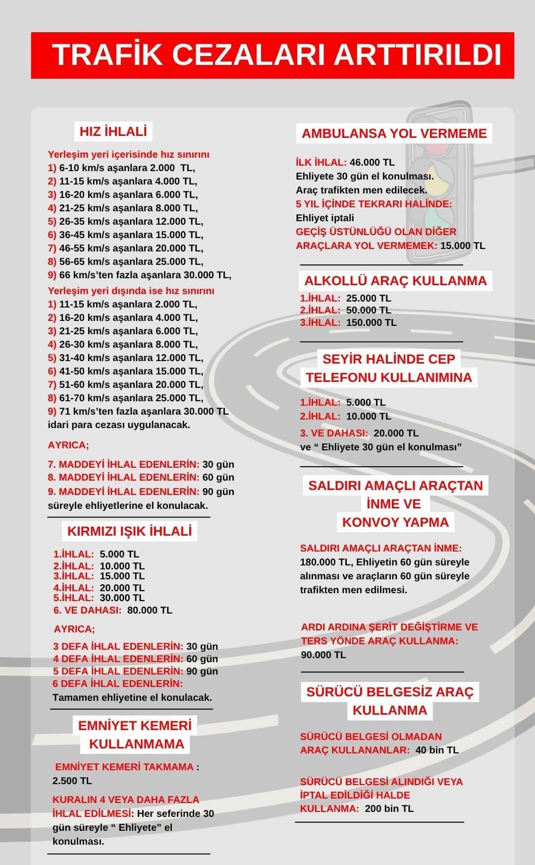 Ambulans, itfaiye ve can kurtaran araçlarına yol vermeyen sürücülere 46 bin TL ceza kesilecek ve ehliyetlerine 30 gün el konulacak. Gürültü kirliliği yaratan araç modifikasyonlarına karşı ise 16 bin TL ceza uygulanacak. Ayrıca, araç kullanırken cep telefonu gibi dikkat dağıtıcı cihazlar kullanan sürücülere 5 bin TL para cezası kesilmesi öngörülüyor.