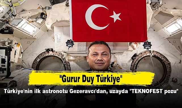 Türkiye'nin ilk astronotu Gezeravcı, "Ülkemi uluslararası alanda saygın bir bilim ve teknoloji gücü yapmak için gururla ilerlerken Ay-Yıldızlı bayrağımızla birlikte bir klasik haline gelen TEKNOFEST pozu da bana eşlik ediyor." ifadesini kullandı.