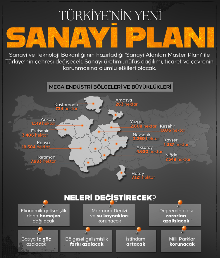 Yeni plan, Anadolu’nun ortasında Karadeniz’den Akdeniz’e uzanan güçlü bir sanayi kuşağı oluşturmayı hedefliyor.