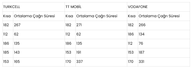 Yılın ikinci çeyreğinde, 3 operatörden en sık yapılan 5 kısa numara ve ortalama çağrı süreleri (saniye) ise şöyle: