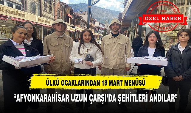 Ülkü Ocakları Afyonkarahisar Asenalar Birimi Başkanlığı 18 Mart Çanakkale Şehitlerinin yıldönümünde Afyonkarahisarlılara Çanakkale şehitlerinin anısına Ekmek ve üzüm kurusu dağıttı. Ülkü Ocakları Asenalar Birimi Başkanı Hilal Kalafat, “Biz Ülkü Ocakları olarak bugün canlarını vatan için feda eden tüm şehitlerimizi anıyoruz. Başta Gazi Mustafa Kemal Atatürk olmak üzere tüm silah arkadaşlarını minnetle yad ediyoruz. “ dedi. Kalafat bugün Türk milleti olarak özgür ve hür br şekilde Anadolu topraklarında yaşadığımızın altını çizerek, “ Bugün bu topraklarda hür ve özgür bir şekilde yaşıyor isek başta Mustafa Kemal Atatürk ve aziz şehitlerimize borçluyuz” dedi.>>ÖZEL HABER:EVREN ATCI OGUZHAN ÖZDEMİR