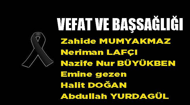 Dumlupınar Mahallesinden, merhum İbrahim Mumyakmaz’ın eşi, Hatice Turunç, Kadir Mumyakmaz, Mustafa Mumyakmaz, Güzide Karayiğit’in annesi, merhum Ali Turunç ve Fatih Karayiğit’in kayınvalidesi Zahide Mumyakmaz vefat etmiştir.