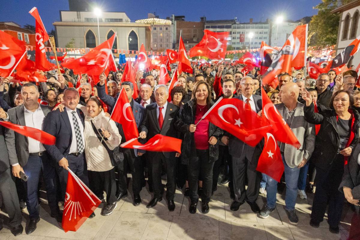 Cumhuriyetin, kadınların özgürce nefes aldığı, gençlerin umutla geleceğe baktığı, halkın sözünün değer kazandığı bir büyük devrim olduğunu belirten Başkan Burcu Köksal, “Cumhuriyet, bize özgürlük, eşitlik, adalet, kardeşlik ve dayanışma kazandırdı. Ve biz biliyoruz ki: Cumhuriyet, bu ülkenin en büyük zaferidir! Bugün burada, bu meydanda, hep birlikte haykırıyoruz: Bizler, Atatürk’ün ilke ve devrimlerinden asla vazgeçmeyeceğiz! Bizler, Cumhuriyetimizi her koşulda, her şartta koruyacak, yaşatacak, güçlendireceğiz! Çünkü biz Cumhuriyetle var olduk, Cumhuriyetle var olacağız!” ifadelerini kullandı.