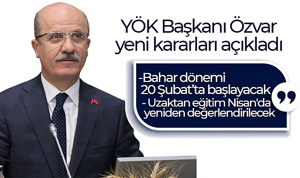 YÖK Başkanı Özvar bahar döneminin 20 Şubat'ta uzaktan eğitimle başlatılabileceğini, nisan başı itibarıyla yüz yüze eğitimin de olduğu hibrit seçeneğin değerlendirileceğini açıkladı.
