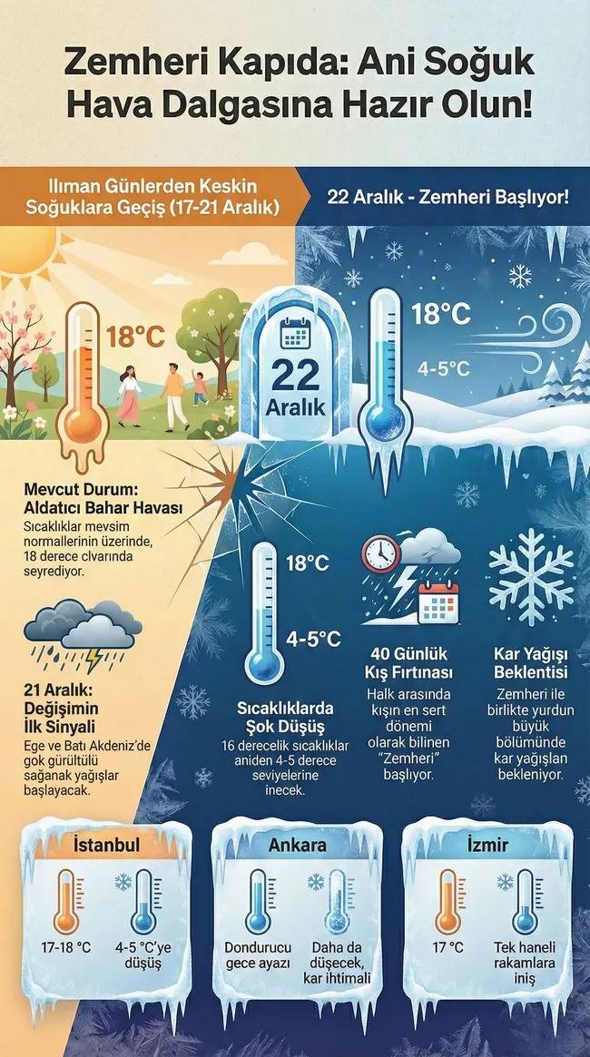 20 Aralık Cumartesi günü son kez güneşli ve ılık bir hava bekleniyor. 21 Aralık Pazar günü ise Ege ve Batı Akdeniz üzerinden gelen gök gürültülü sağanaklar sistemin girişini işaret edecek. Asıl büyük değişim 22 Aralık’ta yaşanacak. Zemheri’nin başlamasıyla sıcaklıklar bıçak gibi kesilerek 4–5 dereceye kadar gerileyecek.